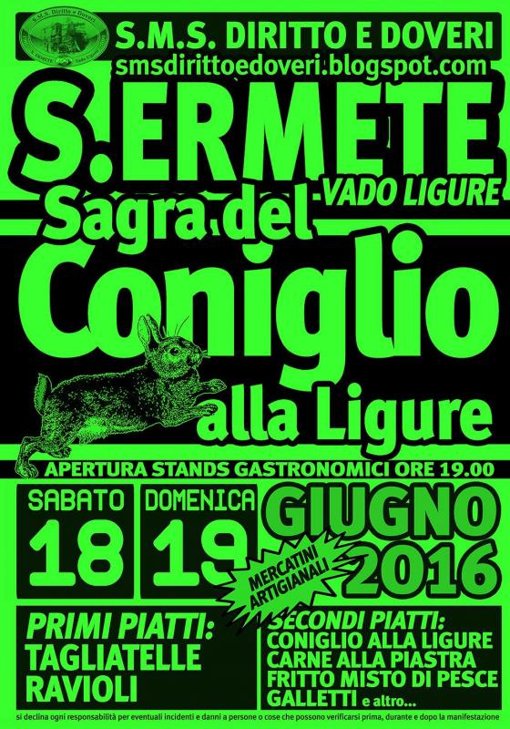La tradizionale sagra del coniglio a Sant'Ermete di Vado Ligure quest'anno si terrà il 18 e 19 giugno 2016.