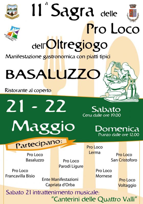 L'11° Sagra delle Pro Loco dell'Oltregiogo si svolge Sabato 21 e Domenica 22 Maggio 2016 a Basaluzzo (AL) e si potranno gustare i piatti della tradizione cucinati dalle Pro Loco partecipanti.