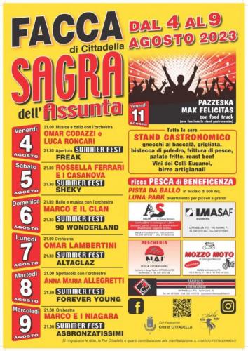 Sagra dell'Assunta a Facca, la Festa del Paese di Facca di Cittadella si svolge dal 4 al 9 Agosto 2023, stand gastronomico aperto tutte le sere, orcheste e musica dal vivo con ipsta da ballo e grande pesca di beneficenza