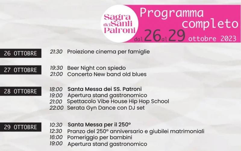 Dominica 29/10: Alla mattina, l'importante celebrazione per il 250° anniversario di consacrazione della nostra Chiesa. Il pranzo presso lo stand gastronomico è dedicato ai giubilei di matrimonio. Altro pomeriggio dedicato ai più piccoli. Serata conclusiva, con bar aperto dalle 18:00 per l'ora dell'aperitivo e dalle 19:00 stand gastronomico aperto a tutti!