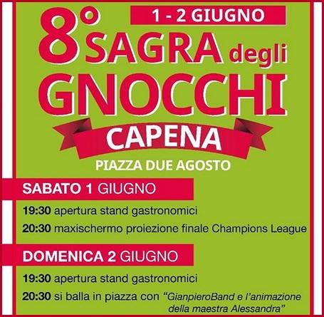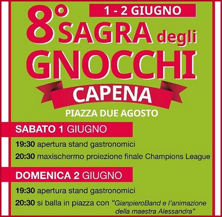 Sabato 01 e Domenica 02 Giugno 2019 si svolge la Sagra Degli Gnocchi 2019 a Capena, un fine settimana tutto dedicato all'enogastronomia locale e, naturalmente, agli gnocchi.
