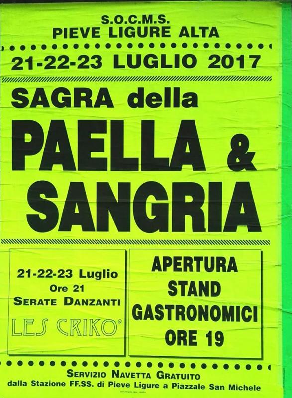 Da Venerdì 21 a Domenica 23 luglio 2017 la S.O.C.M.S. di Pieve Ligure Alta invita alla Sagra della Paella e Sangria 2017 a Pieve Ligure in Piazza San Michele