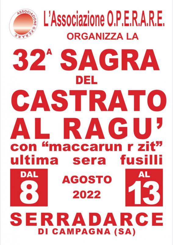 Giunta alla 32 edizione la rinominata Sagra del Castrato al Ragù cù Maccarun r' Zit a Serradarce di Campagna (SA) si tiene dall'8 al 13 agosto 2022.