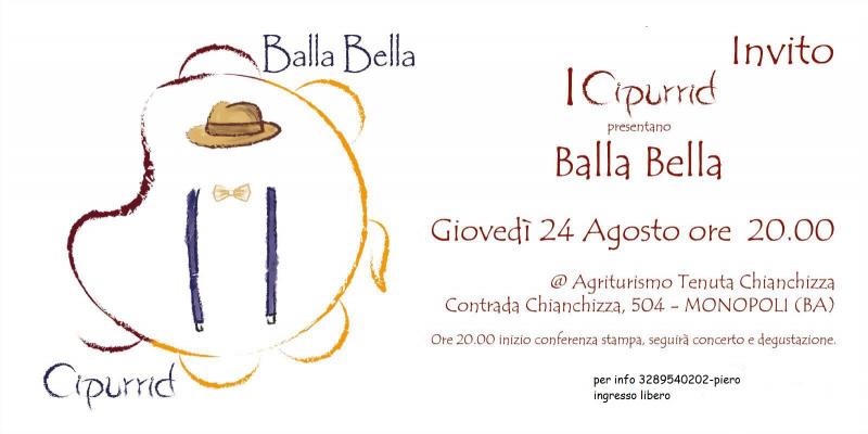 Il gruppo di musica popolare “CIPPURRID” presentano il giorno 24 agosto il loro secondo album chiamato BELLA-BALLA presso la Tenuta chianchizza a monopoli. Ore 20.00 conferenza stampa, seguirà concerto popolare pizzica e tarantella e sagra del panzerotto e zampina.