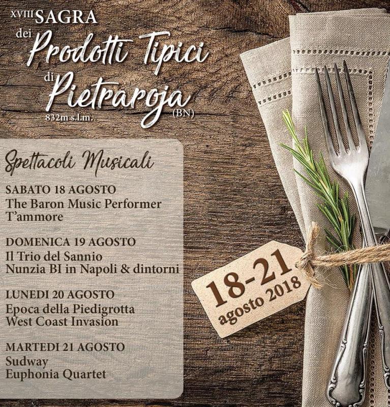 In Piazza Vittoria e nell’adiacente piazzetta dell’Edificio Scolastico sono allestiti stand gastronomici, con circa 1000 posti a sedere, che propongono numerosi piatti tipici ed il famoso prosciutto di Pietraroja dai primi piatti ai prodotti da forno, dai formaggi ai salumi, dalle carni ai dolci, si distinguono i “carrati”, una pasta fresca di grano duro fatta a mano con rettangoli di pasta arrotolati su un ferretto e condita con sugo di pecora, noci e pecorino del luogo, sapientemente preparata nel rispetto di una tradizione secolare.