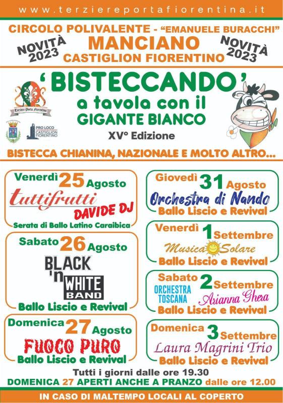 BisteccandoSagra della Bistecca Chianina e Nazionale a Castiglion Fiorentino (AR), nei giorni 25-26-27 e 31 Agosto e 1-2-3 settembre 2023 si terrà la nuova edizione di Bisteccando.