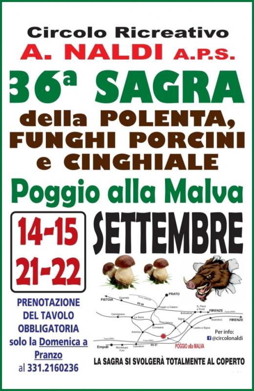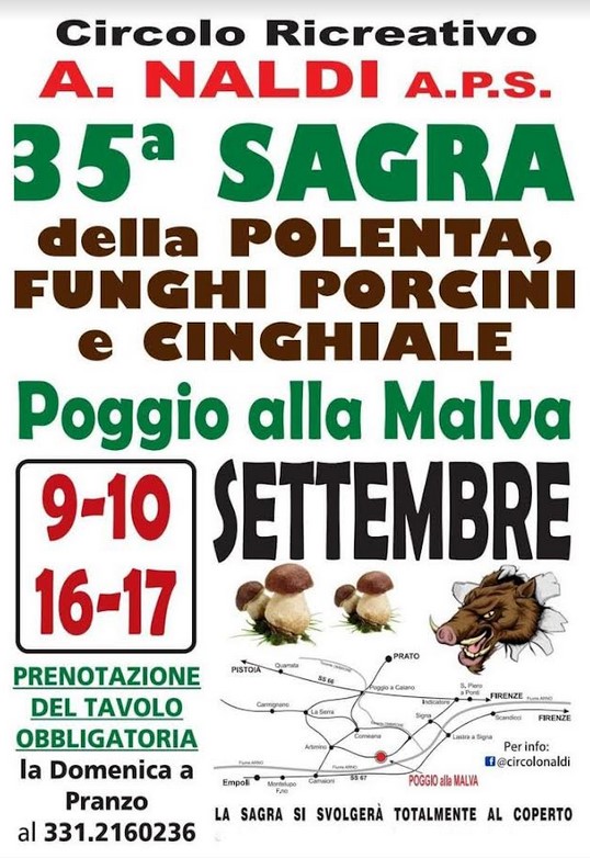 Torna da Sabato 13 Settembre per due fine settimana, l’appuntamento annuale con storica Sagra della polenta, funghi porcini e cinghiale, giunta ormai alla 36 esima edizione, organizzata dal Circolo Arci “A. Naldi” di Poggio alla Malva (Via Buricchi 1) Carmignano (Prato)