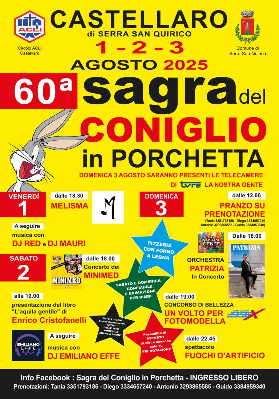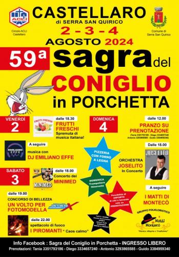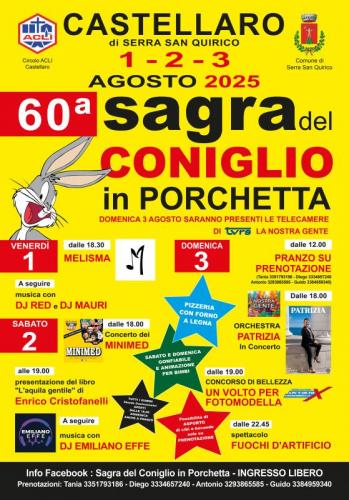 Ritorna come ogni anno la famosa ed unica Sagra del Coniglio in Porchetta di Castellaro di Serra San Quirico, giunta alla 60° Edizione. Questa Manifestazione d'interesse collettivo si svolgerà dal 1 al 3 agosto 2025 ed anche quest’anno sarà organizzata dal circolo ACLI di CASTELLARO.