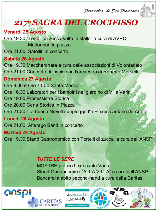 Nel pomeriggio, il giardino di Villa Varini sarà dedicato ai più piccoli e le loro famiglie con “Che spettacolo di sagra!”, performer il giovane S. Marchi, Laboratori di pittura, “Trucco&Parrucco: ci prepariamo insieme per la processione storica”, in collaborazione con l’associazione Un Piccolo Passo e il Circolo Laudato sì di San Possidonio. Dalle 19 processione storica da via Andreola 1, casa natale di don Giuseppe Andreoli, martire del Risorgimento, la Croce percorrerà le vie del paese accompagnata dal parroco, dai fedeli e dalla banda Giustino Diazzi di Concordia. Arrivo nella piazza del paese dove ci sarà un momento di preghiera comunitaria.