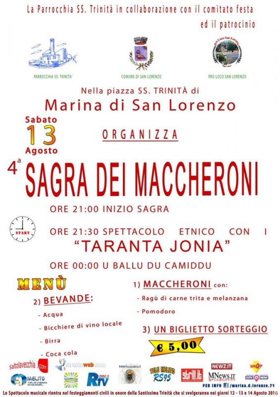 Si rinnova l'appuntamento con la "SAGRA DEI MACCHERONI" organizzata dal Comitato Festa "S.S. Trinità". L'idea di questo evento è nata quattro anni fa per "movimentare" un pò le serate estive e far divertire la popolazione del luogo e i tanti turisti presenti nel territorio laurentino. Come dice il nostro Parroco Don Giovanni Zampaglione - in questi due anni la sagra ha riscosso tanto successo e si è deciso di continuare con questa bellissima esperienza per coinvolgere ancora una volta l'intera comunità - . Faranno da cornice la tradizione culinaria, la musica etnico/popolare e il tanto divertimento.