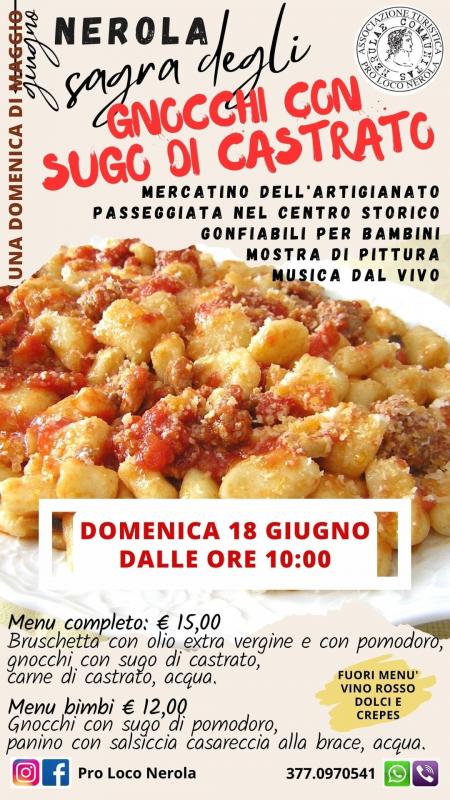 Sapori Nerolesi vi aspettano in questa domenica di primavera da trascorrere insieme alla famiglia. Piatto protagonista i gnocchi con il sugo di castrato, gnocchi casarecci ed un sugo da leccarsi i baffi! Inoltre carne di castrato, bruschette con olio extra vergine d'oliva delle colline di Nerola e le famose salsicce artigianali del macellaio del paese, cotte sulla brace e servite in un panino con cicoria ripassata.
