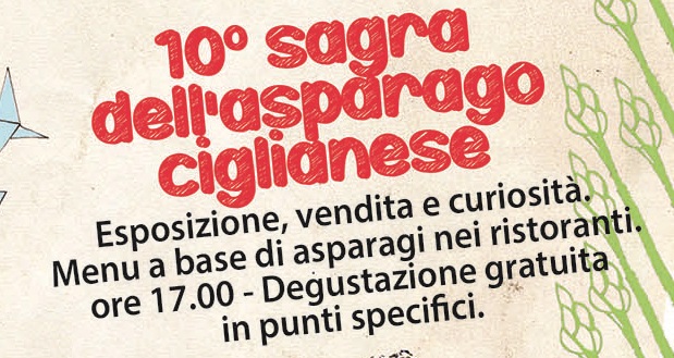 Il Comune di Cigliano organizza nel giorno della Festa del Lavoro, 1° maggio, dalle ore 8.00 alle ore 19.00, l'11^ edizione della mostra mercato "Fantasia e creatività in strada - La carta racconta" e la 10^ "Sagra dell'asparago ciglianese".