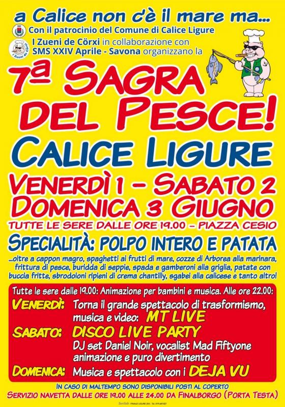 Con il patrocinio del Comune di Calice Ligure, i Zueni de Corxi in collaborazione con SMS XXIV aprile – Savona organizzano venerdì 1 giugno, sabato 2 giugno e domenica 3 giugno la 7^ edizione della Sagra Del Pesce.