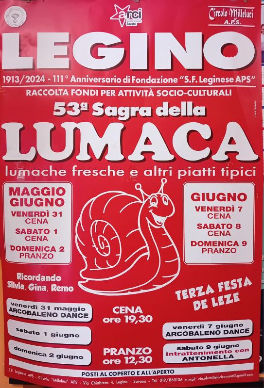 torna, nel quartiere di Legino a Savona, la tradizionale Sagra della Lumaca, per la 53° edizione nei giorni 31 maggio 1, 2 - 7, 8, 9 Giugno 2024