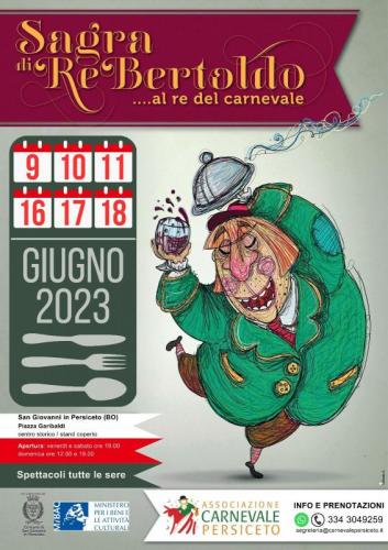 La Sagra di Re Bertoldo ritorna a Persiceto nel mese di giugno, nei weekend del 9-11 e 16-18. Promossa dall’Associazione Carnevale Persiceto con il patrocinio del Comune, la sagra farà immergere il centro storico del paese in un’atmosfera bertoldesca e medievale e offrirà le prelibatezze del “Menù di Re Bertoldo”. Fra i vari scritti del padre letterario del Bertoldo – lo scrittore Giulio Cesare Croce nato a Persiceto nel 1550 – si trova anche “L’Eccellenza, et Trionfo del Porco”: la carne di maiale non mancherà di certo anche nel menù dello stand gastronomico che sarà allestito in piazza Garibaldi.