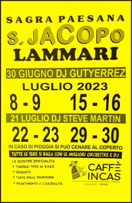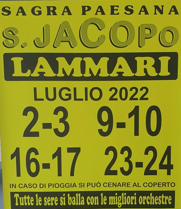 Sagra paesana San Iacopo a Lammari di Capannori (LU) al circolo parrocchiale A.N.S.P.I. si svolgera' nei giorni 08/09 - 15/16 - 21/22/23 - 27 - 29/30 Luglio 2023.