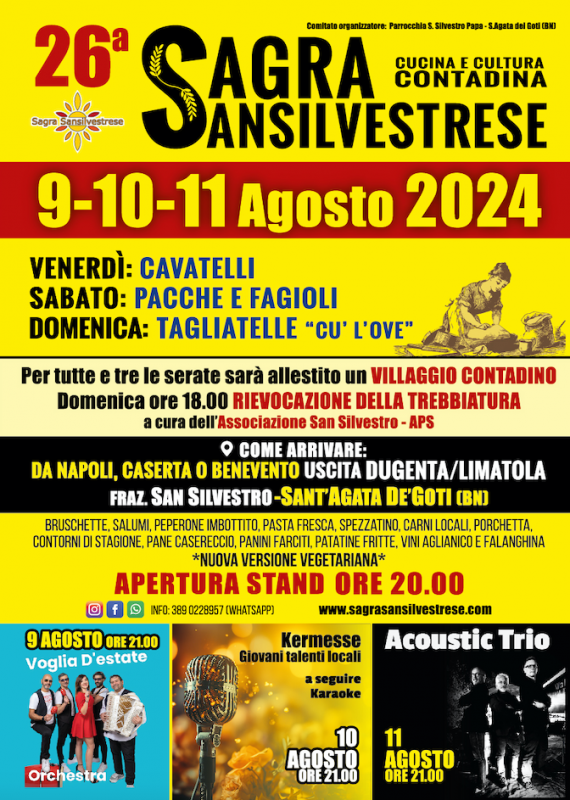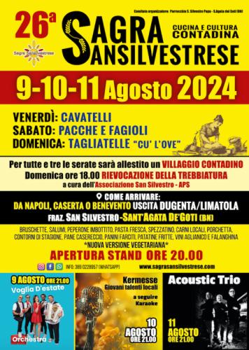 La sagra sansilvestrese è giunta alla XXVI edizione.. . In una ridente collina sannita, coccolati dalla natura, potrete gustare le nostre specialità locali: salumi, bruschetta, peperone imbottito, pasta fresca di giornata (Cavatelli, Pacche e Fagioli, Tagliatelle cu l’ove), spezzatino, carni locali alla brace, porchetta , contorni di stagione, dolci fatti in casa, pane casereccio e vini aglianico e falanghina delle cantine Ciervo. Inoltre panini farciti, patatine fritte, bibite... e la nostra nuova proposta vegetariana! Non mancare…Provare per credere. Si ricorda per chi viene da Caserta Napoli e Benevento dalla Fondo Valle Isclero di prendere uscita Dugenta e seguire la segnaletica, oppure di cercare Sagra Sansilvestrese su Maps.