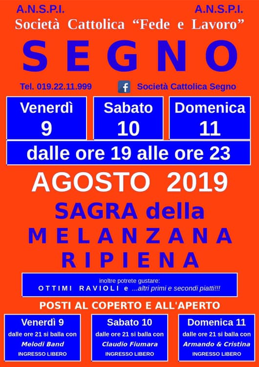 La Sagra della Melanzana Ripiena a Segno di Vado Ligure (SV) si svolge dal 9 all'11 agosto 2019.
