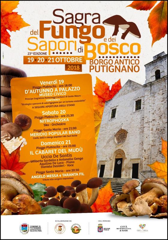 Torna il consueto appuntamento autunnale con la Sagra del Fungo e dei Sapori di Bosco, che il Comune di Putignano - Assessorato Cultura e Turismo – promuove e organizza assieme all’Associazione Putignanese Cercatori Funghi e all’Associazione Putignanese Funghi.