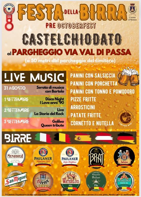 VIII FESTA DELLA BIRRA A CASTELCHIODATO MENTANA DAL 31/08/2023 AL 03/09/2023 PRESSO IL PARCHEGGIO DI VIA VAL DI PASSA,MUSICA LIVE TUTTE LE SERE E STAND GASTRONOMICI .