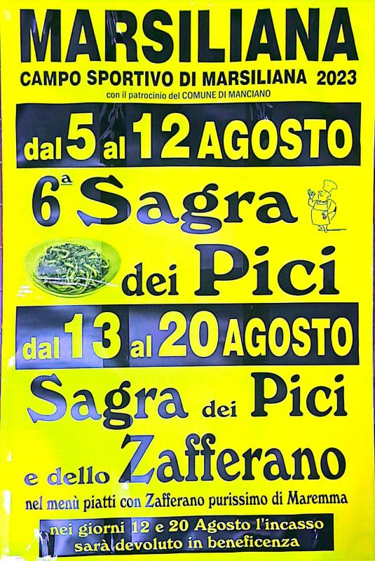 Dal 13 al 20 Agosto 2023 a Marsiliana, frazione di Manciano (GR), si tiene la Sagra dei pici e dello Zafferano.