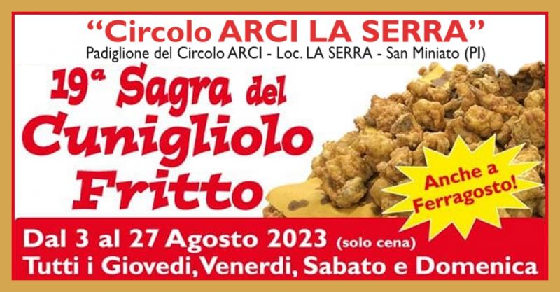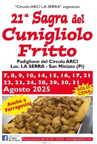 La 21a edizione della Sagra Del Cunigliolo Fritto si svolge a La Serra, frazione di San Miniato (PI) nei seguenti giorni 7, 8, 9, 10, 14, 15, 16, 17, 21, 22, 23, 24, 28, 29, 30, 31 agosto 2025.