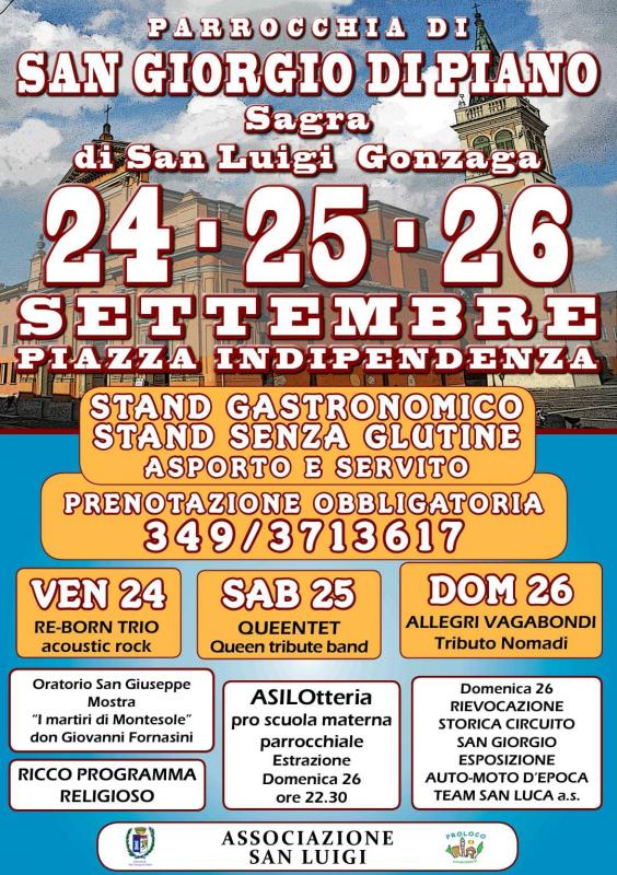 Dal 24 al 26 settembre il centro storico di San Giorgio sarà animato dalla storica sagra parrocchiale di San Luigi Gonzaga, con stand gastronomico, spettacoli musicali, auto-moto raduno e celebrazioni religiose.