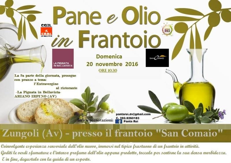 E’ un opportunità per visitare il luogo di produzione, trasformazione e vendita dell’olio extravergine d’oliva. Ma soprattutto, un’occasione per degustare ed apprezzare le caratteristiche uniche del prodotto locale e per conoscere la filiera dell’olio, che va dal campo alla nostra tavola. Uno dei più antichi e nobili alimenti della nostra piramide alimentare e principe della “dieta mediterranea”, per chi interessato nell’esperienza dell’acquisto a Km 0. L’evento di questa edizione è promosso dall’Associazione enogastronomica “Pantarei” in collaborazione con CRAL - Cgil Avellino - Frantoio San Comaio e ristorante La Pignata in Bellavista.