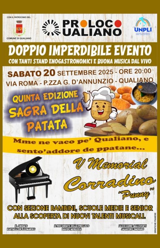 Ci sarà tanto da degustare per la quinta edizione della Sagra della Patata (presto vi comunicheremo le attività commerciali coinvolte) e tanta buona musica da ascoltare con la quinta edizione del Premio Corradino.