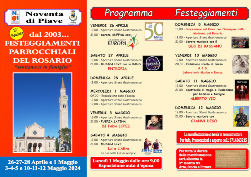 Oramai è una delle feste consolidate nel territorio del basso Piave e non solo. Questì'anno parte il 26 aprile e termina il 12 MAGGIO! Negli anni abbiamo constatato la presenza di amici da tutto il Triveneto ma anche da vicino Friuli. La qualità è stata la scelta che l'Associazione NOI , organizzatrice dell'evento, ha fatto sin dall'inizio, sia nell'offerta culinaria che nella scelta dei gruppi musicali. Anche quest'anno non saremo da meno con le specialità della griglia, dal classico Costa e polenta al Galletto....e salsiccia...cucinate alla perfezione...