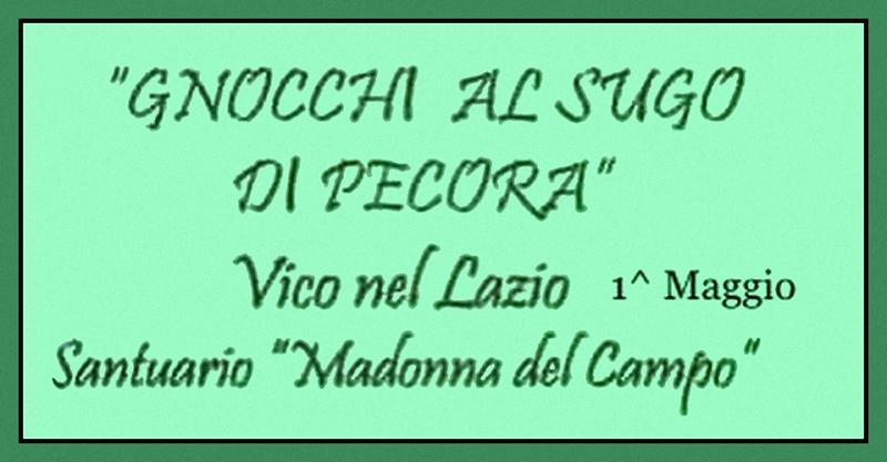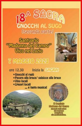 Presso il Santuario "Madonna del Campo" a Vico nel Lazio in provincia di Frosinone si svolge nella giornata di Giovedì 01 Maggio 2025, dalle ore 12.30, la 20a edizione della Sagra degli Gnocchi al sugo di Pecora.