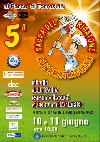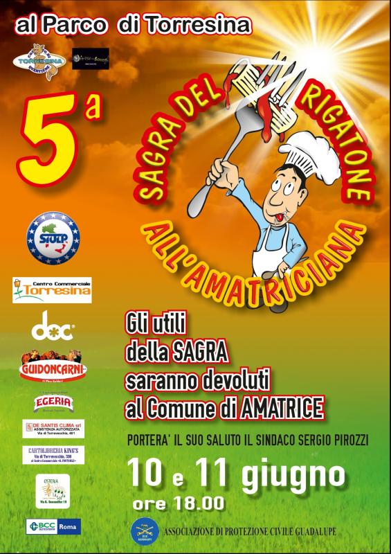 Siamo lieti d’invitarvi alla “V Sagra del Rigatone all’Amatriciana” prevista nel Parco Pubblico Zietta Liù a Torresina nei giorni di sabato 10 e domenica 11 giugno 2017 con inizio alle ore 18.00.