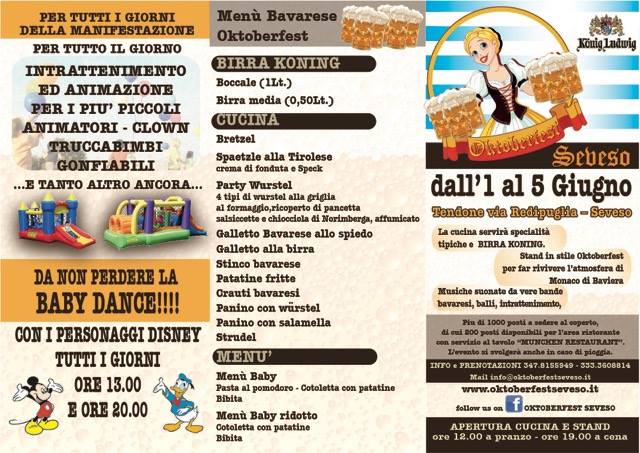 Cucina con specialità tipiche bavaresi, stand in stile Oktoberfest per far rivivere l’atmosfera di Monaco con musiche suonate direttamente da vere bande bavaresi, balli, intrattenimento, pietanze, specialità tipiche e BIRRA KONIG LUDWIG.