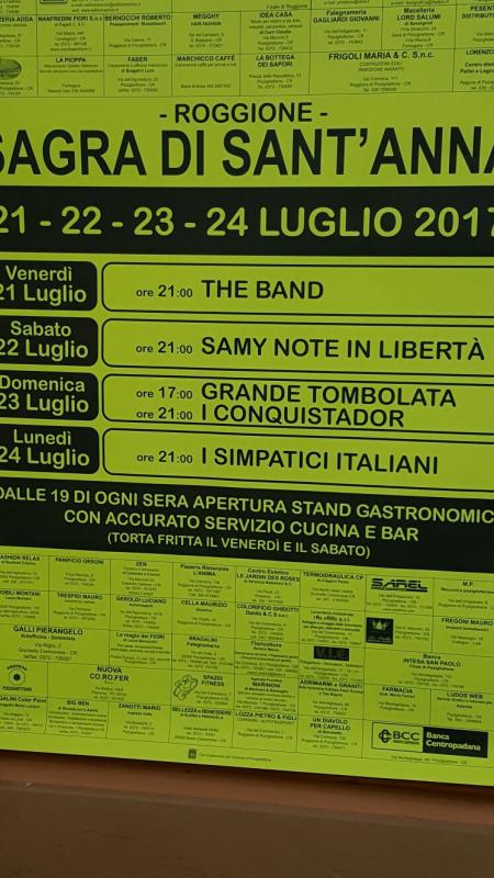 Da venerdì 21 a lunedì 24 luglio 2017 si svolge presso la Parrocchia di Roggione la Sagra di S. Anna con animazione, musica, concorso canoro, tombolata, gastronomia.