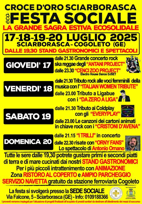 Da giovedì 17 a domenica 20 luglio 2025 torna la grande SAGRA estiva organizzata dalla Croce d'Oro a SCIARBORASCA nel comune di Cogoleto in provincia di Genova.