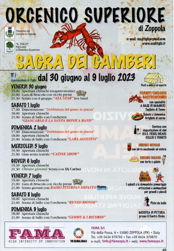 La Sagra dei gamberi a Orcenico Superiore (PN) si svolge dal 3o giugno e 1-2 -5-6-7-8-9 luglio 2023.
