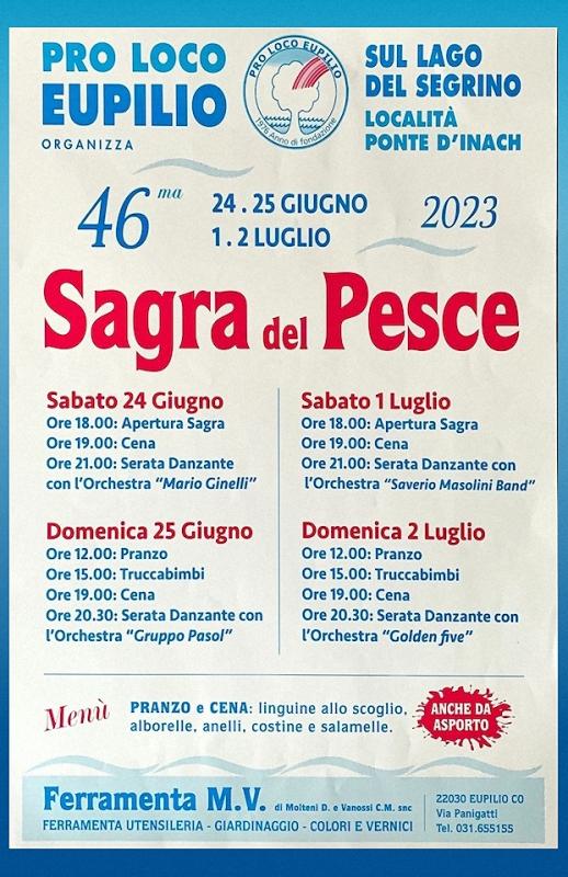 La 46a edizione della Sagra del Pesce a Eupilio (CO) si svolge nei giorni 24/25 Giugno e 01/02 Luglio 2023 sul lago del Segrino in Localita Ponte D'inach.