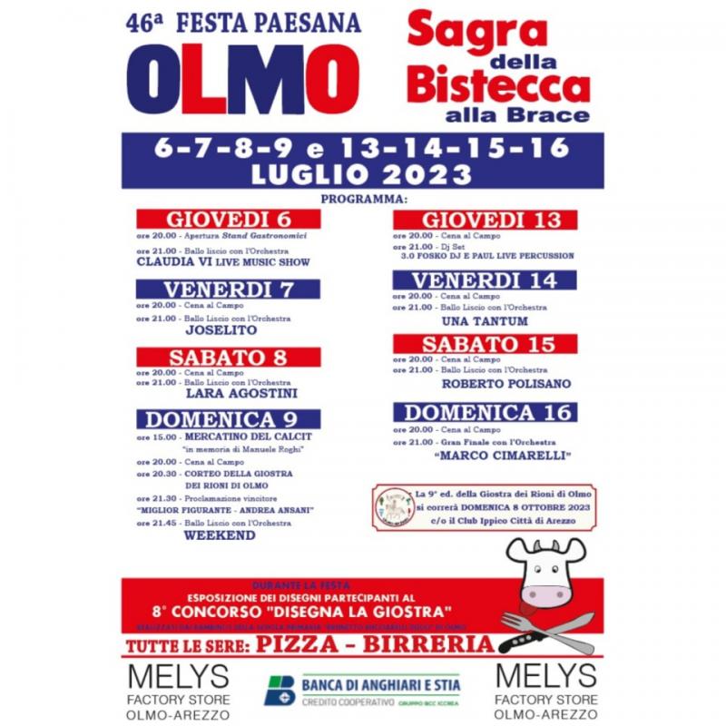 La bistecca alla fiorentina è il piatto toscano più famoso. Ci sono dubbi sull’origine del nome: c’è chi lo fa risalire alla celebrazione della Festa di San Lorenzo da parte della Famiglia dei Medici. Per altri la nascita del nome è legata alla presenza degli inglesi nell’800. Comunque sia, è certo che per godersela appieno basta venire a Olmo a pochi chilometri da Arezzo. Dal 1975 a luglio la bistecca si celebra come fosse un dio pagano, servita tassativamente alla brace, con l’accompagnamento di orchestre di liscio alla cui musica è impossibile resistere. Da quest’anno Amaro Ramazzotti amplifica il divertimento con giochi e degustazioni.