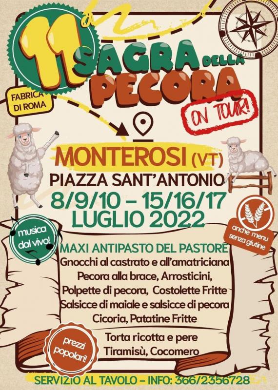 A Monterosi (VT) la Sagra della Pecora non può mancare, per due week end consecutivi 8-9-10 e 15-16-17 Luglio 2022 in piazza Sant'Antonio si rinnova il tradizionale appuntamento con il gusto, arricchito dalle immancabili novità.