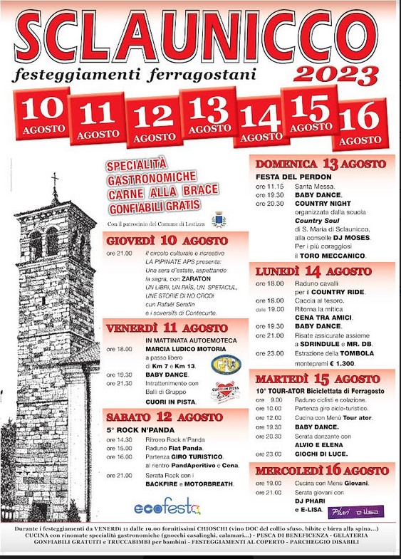 Domenica 12 agosto tradizionale Festa del Perdon. A seguire serata Country Night organizzata dalla Scuola Country Soul di Santa Maria di Sclaunicco con DJ Moses alla consolle. Per i più coraggiosi, toro meccanico.