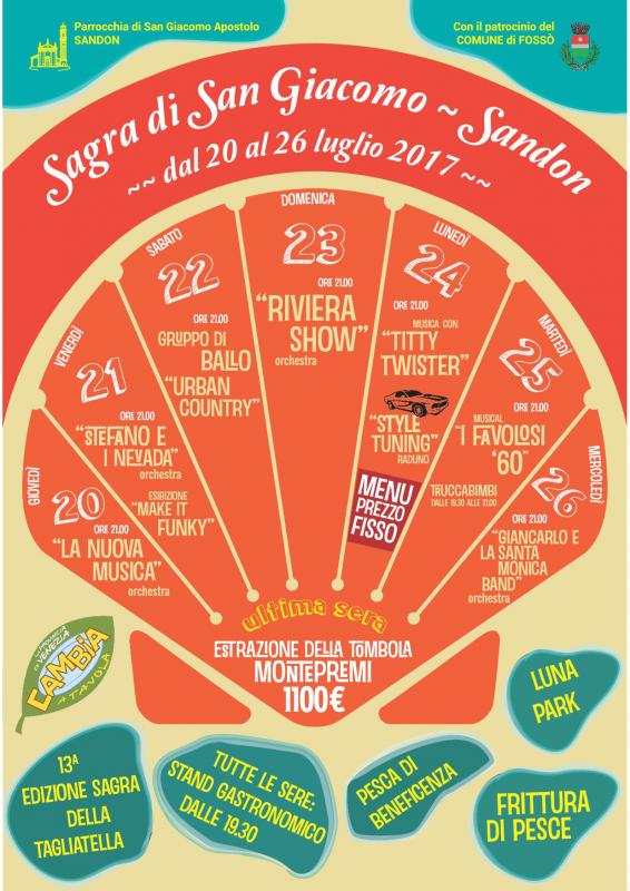Torna la tradizionale Sagra di San Giacomo a Sandon dal 22 al 25 luglio 2022, evento organizzato dal gruppo festeggiamenti della Parrocchia di Sandon in cui troverete ottima cucina e tanti spettaccoli per passare ore in allegria.