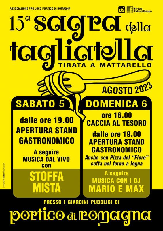 Sabato 5 e domenica 6 agosto 2023 si svolgerà la Sagra della Tagliatella a cura della Pro Loco, che verrà presentata in diverse versioni ed accompagnata da buon vino locale. Alla cena seguirà serata da ballo e musica dal vivo.