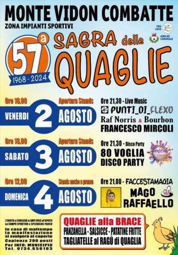 A Monte Vidon Combatte in provincia di Fermo si svolge nei giorn 2, 3, 4 Agosto 2024 la 57a edizione della Sagra delle Quaglie.