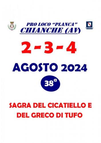 Il 2,3,4 agosto 2024 a Chianche si alza il sipario sulla XXXVIII edizione della Sagra del Cicatiello e del Greco di Tufo la manifestazione, organizzata dalla Proloco Planca, intende far percepire al visitatore un percorso enogastronomico con in prodotti tipici del territorio, arricchendoli anche con tipicità culinarie della tradizione contadina, il tutto accompagnato da musica popolare e non.