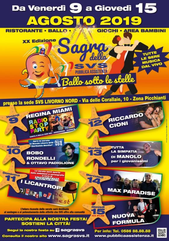 Dal 9 al 15 agosto 2019 torna a Livorno la Sagra del Polpo – Ballo Sottole Stelle sta per aprire i battenti per accogliere tutti coloro che vorranno vivere una serata al fresco, gustando una semplice, ma buonissima cucina e divertendosi con il ballo e le orchestre che ogni sera porteranno un ritmo diverso alla festa.