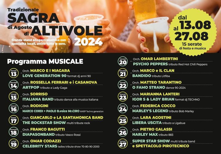 Dal 12 al 26 agosto 2025 torna la Tradizionale Sagra di Agosto di Altivole, e quest’anno sarà INDIMENTICABILE!