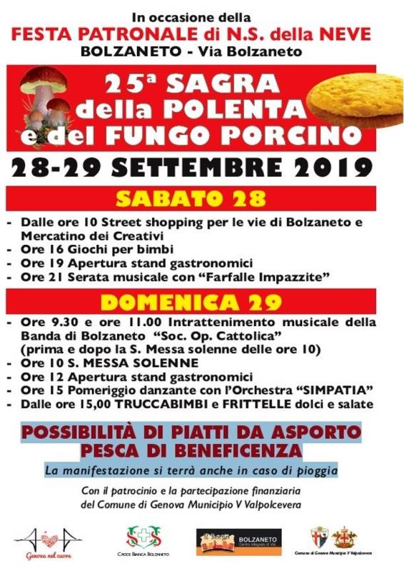 In occasione della Festa Patronale di N.S. della Neve a Bolzaneto, quartiere del Comune di Genova si svolge nei giorni 28 e 29 Settembre 2019 la 25a edizione della Sagra della Polenta e del Fungo Porcino.