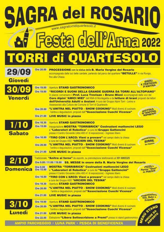 Sagra del Rosario - Festa dell’Arna 2023 a Torri di Quartesolo (VI) (via Roma 93) si svolge dal 29 Settembre al 2 Ottobre 2023.