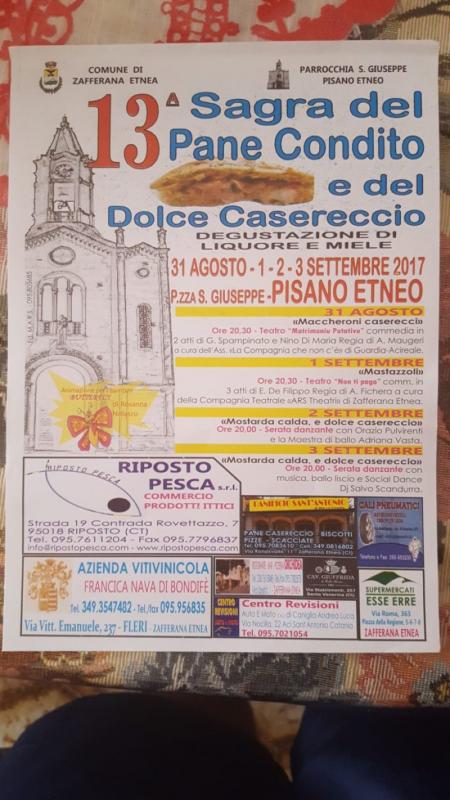 Pane condito, dolci fatti in casa, liquori, miele ma anche teatro e spettacoli. Questo e tanto altro potrà essere gustato alla 13^ edizione della “Sagra del Pane condito e del dolce casereccio”, organizzata dal Comune di Zafferana Etnea, con la collaborazione del consigliere comunale Carmelo Torrisi, e dalla Parrocchia di Pisano, in programma dal 31 agosto al 3 settembre nella piazza San Giuseppe di Pisano.