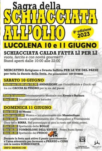 Il 10 e 11 giugno 2023 torna la Sagra della Schiacciata all'olio di Lucolena, dove si può gustare la schiacciata calda fatta lì per lì in tante varianti.